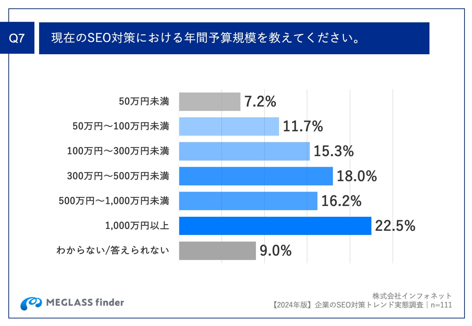 「Q7.現在のSEO対策における年間予算規模を教えてください。」(n=111)と質問したところ、「1,000万円以上」が22.5%、「300万円〜500万円未満」が18.0%、「500万円〜1,000万円未満」が16.2%という回答となりました。