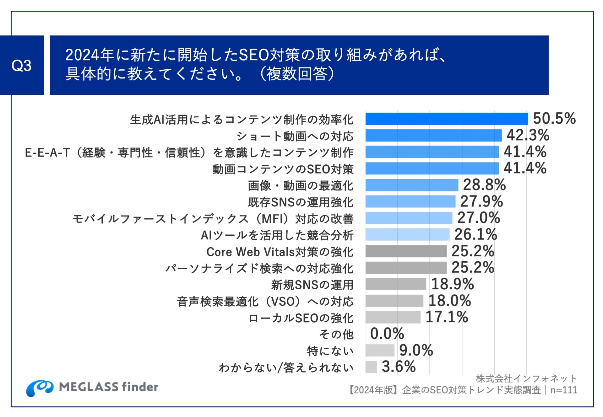 「Q3.2024年に新たに開始したSEO対策の取り組みがあれば、具体的に教えてください。(複数回答)」(n=111)と質問したところ、「生成AI活用によるコンテンツ制作の効率化」が50.5%、「ショート動画への対応」が42.3%という回答となりました。