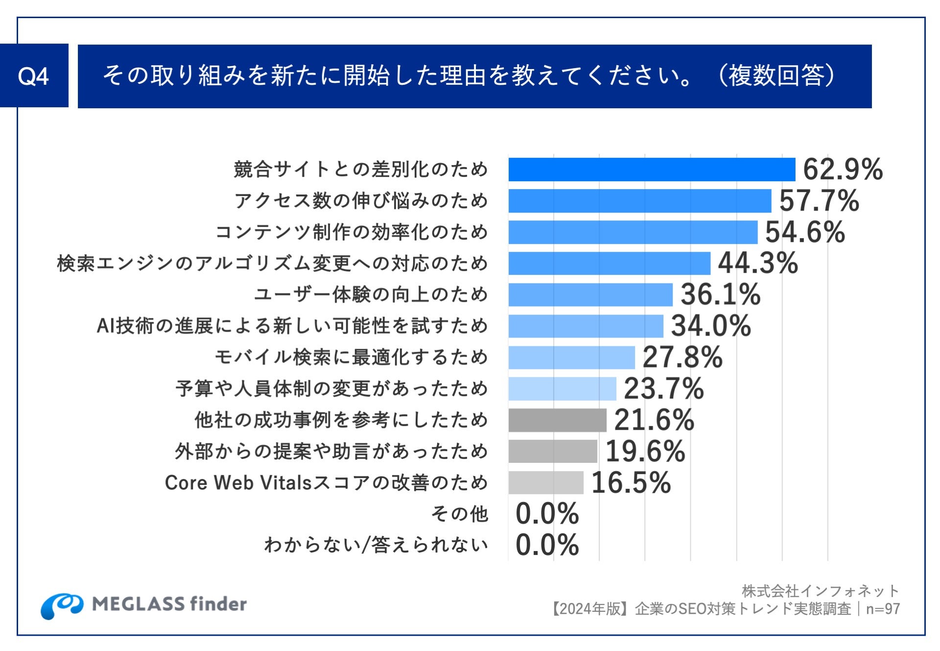 Q3で「特にない」「わからない/答えられない」と回答した方以外に、「Q4.その取り組みを新たに開始した理由を教えてください。(複数回答)」(n=97)と質問したところ、「競合サイトとの差別化のため」が62.9%、「アクセス数の伸び悩みのため」が57.7%、「コンテンツ制作の効率化のため」が54.6%という回答となりました。