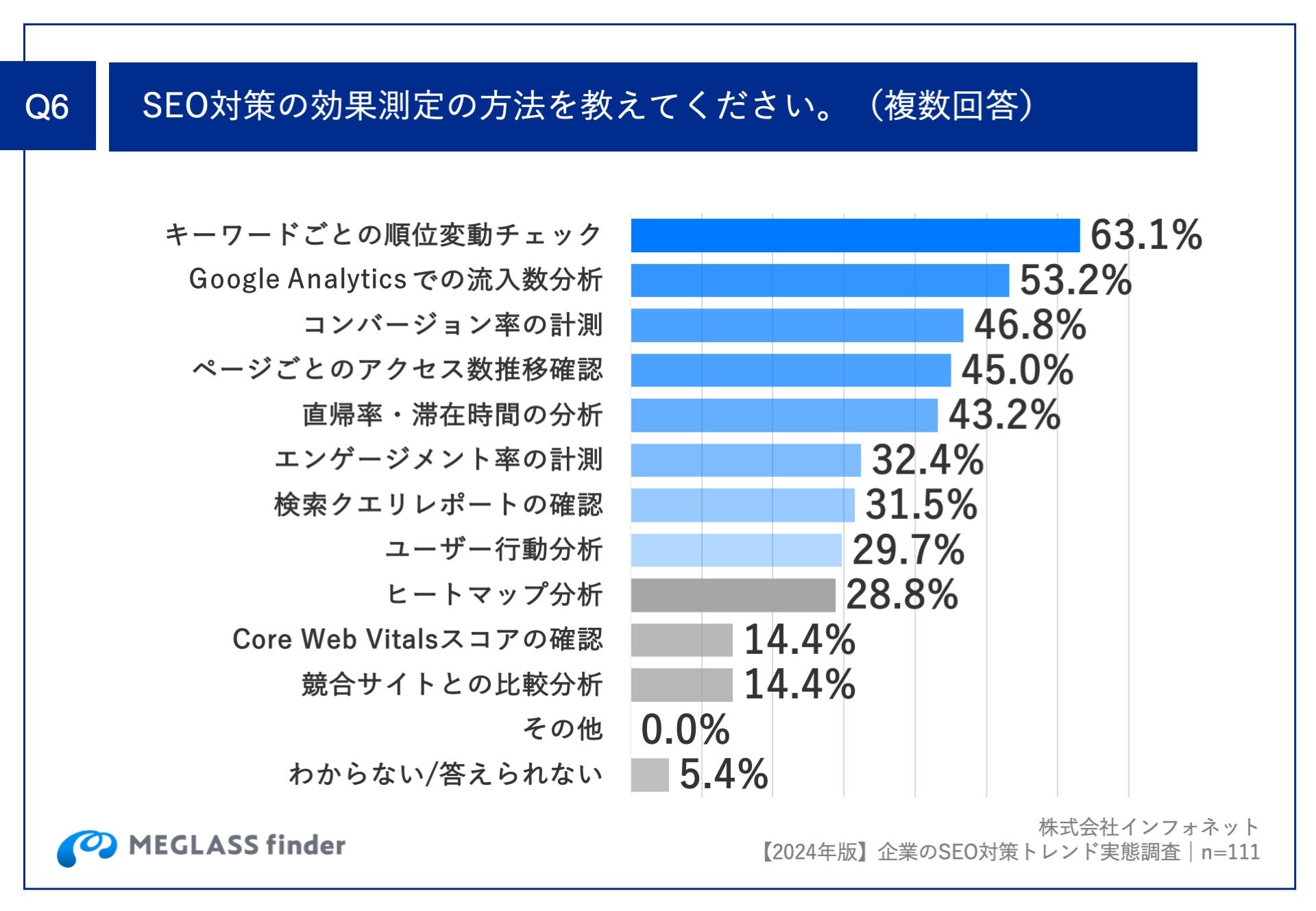 「Q6.SEO対策の効果測定の方法を教えてください。(複数回答)」(n=111)と質問したところ、「キーワードごとの順位変動チェック」が63.1%、「Google Analyticsでの流入数分析」が53.2%、「コンバージョン率の計測」が46.8%という回答となりました。