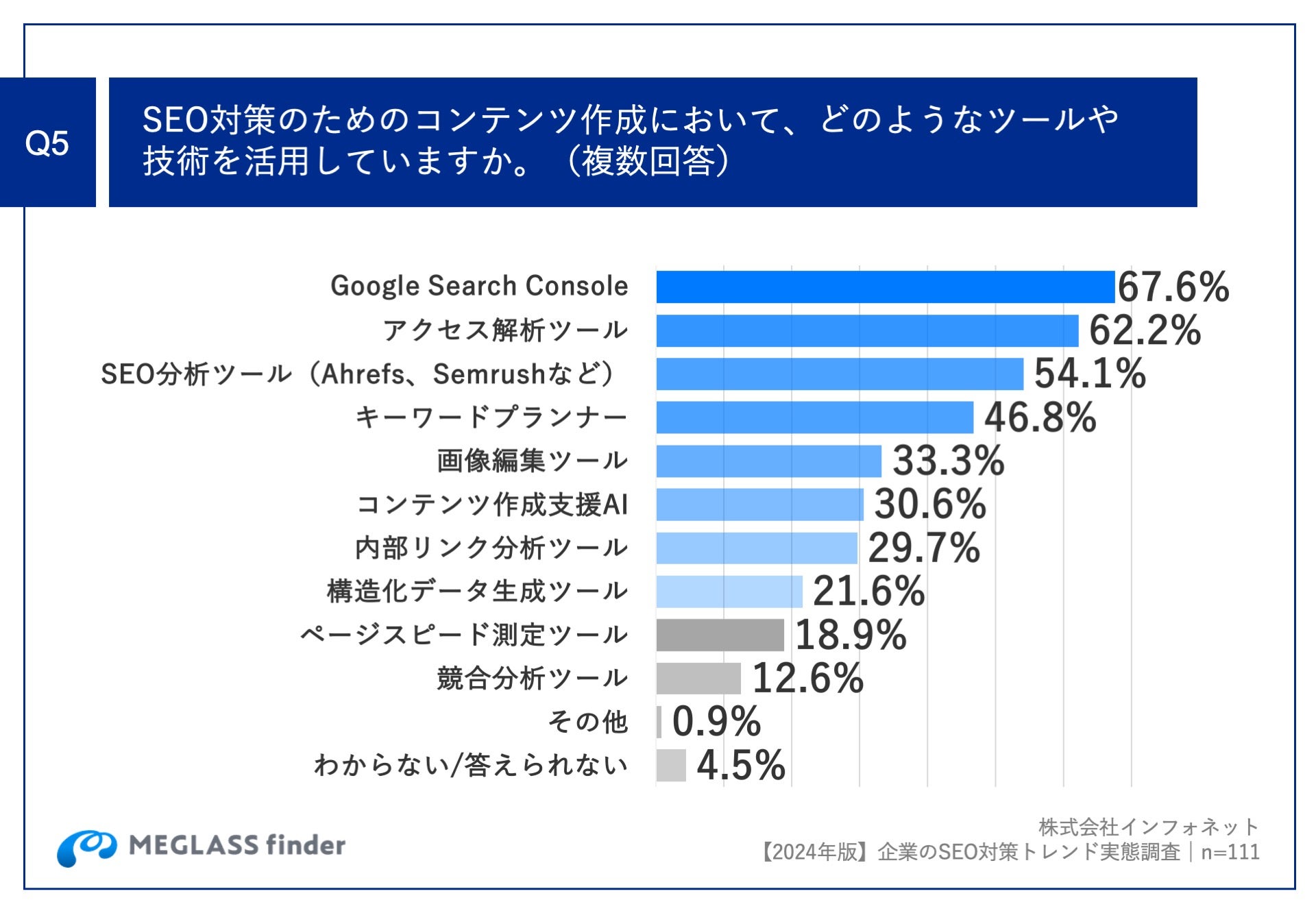「Q5.SEO対策のためのコンテンツ作成において、どのようなツールや技術を活用していますか。(複数回答)」(n=111)と質問したところ、「Google Search Console」が67.6%、「アクセス解析ツール」が62.2%、「SEO分析ツール(Ahrefs、Semrushなど)」が54.1%という回答となりました。