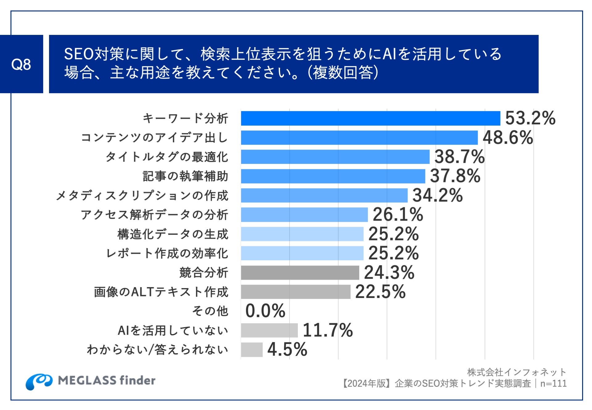 「Q8.SEO対策に関して、検索上位表示を狙うためにAIを活用している場合、主な用途を教えてください。(複数回答)」(n=111)と質問したところ、「キーワード分析」が53.2%、「コンテンツのアイデア出し」が48.6%、「タイトルタグの最適化」が38.7%という回答となりました。