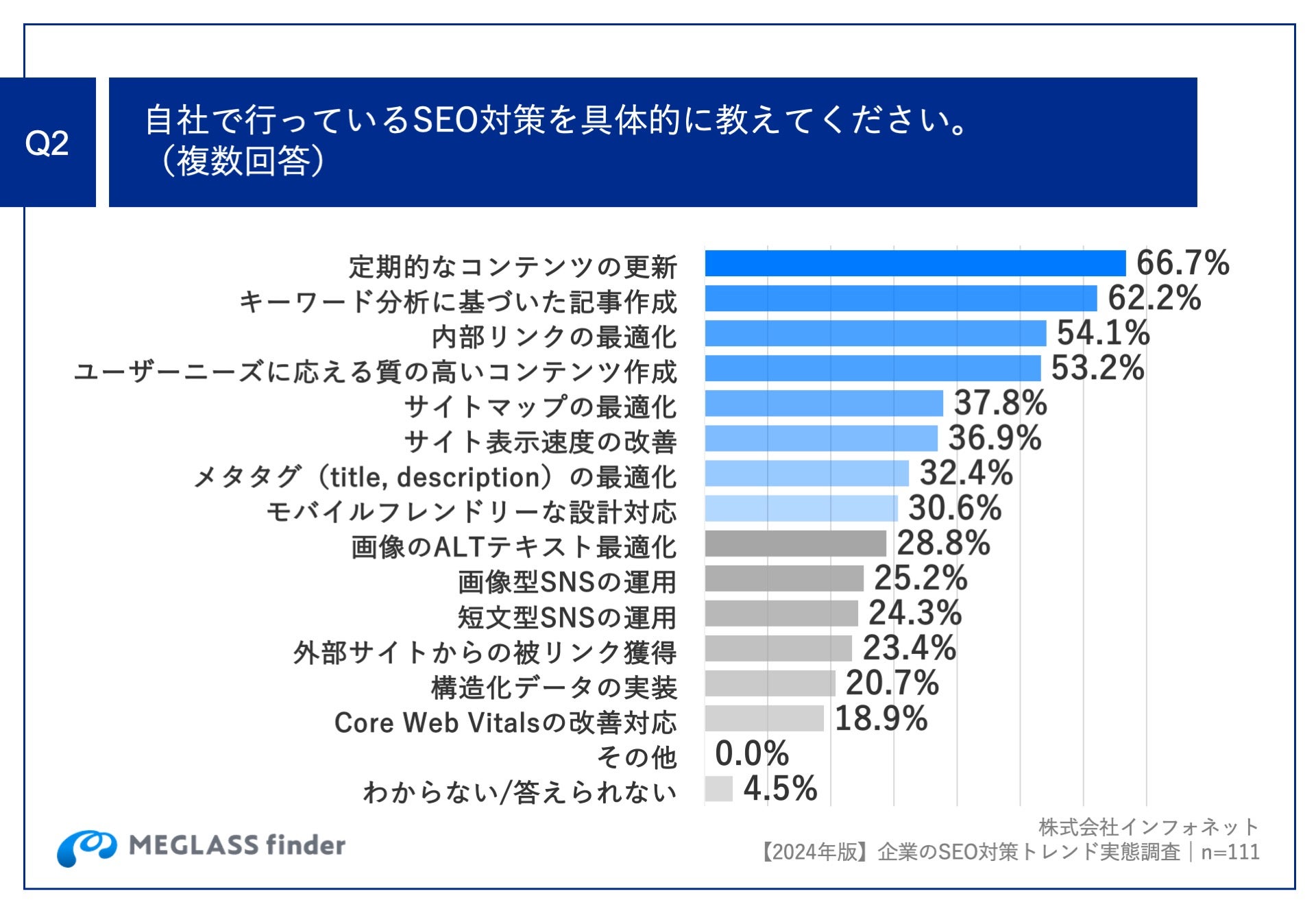 「Q2.自社で行っているSEO対策を具体的に教えてください。(複数回答)」(n=111)と質問したところ、「定期的なコンテンツの更新」が66.7%、「キーワード分析に基づいた記事作成」が62.2%、「内部リンクの最適化」が54.1%という回答となりました。