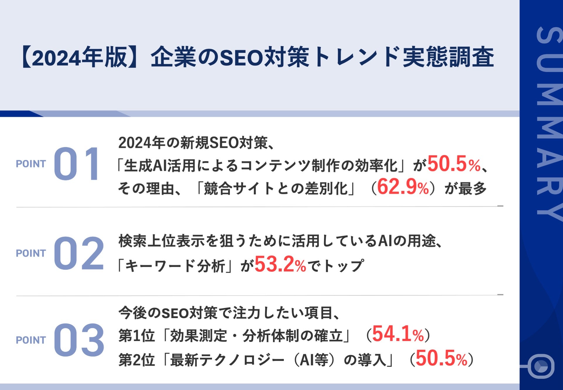 【2024年版|企業のSEO対策トレンド実態調査】2024年の新規SEO対策、「生成AI活用によるコンテンツ制作」が50.5%で最多!検索上位表示を狙うための取り組みも明らかに