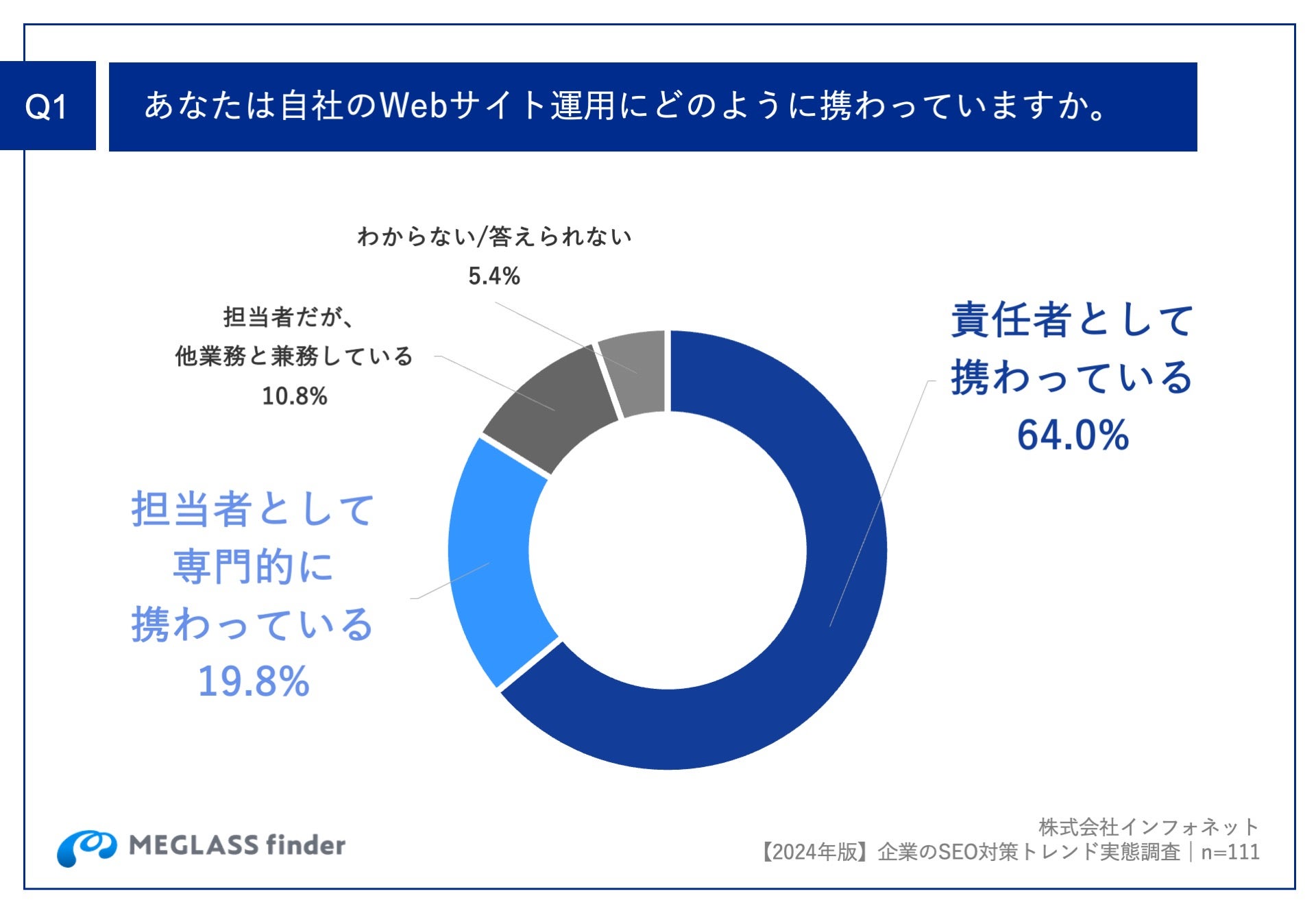 「Q1.あなたは自社のWebサイト運用にどのように携わっていますか。」(n=111)と質問したところ、「責任者として携わっている」が64.0%、「担当者として専門的に携わっている」が19.8%という回答となりました。