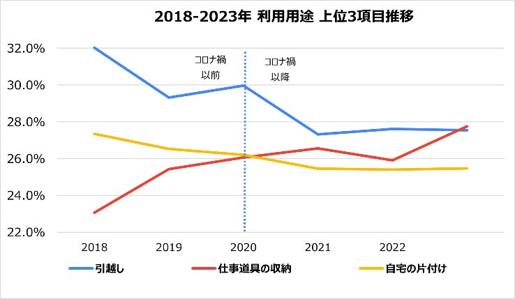 また、利用用途の推移をみると、2018年から2022年までは最も多かった回答は「引越し」で、2023年に初めて「仕事道具の収納」が1位という結果となりました。