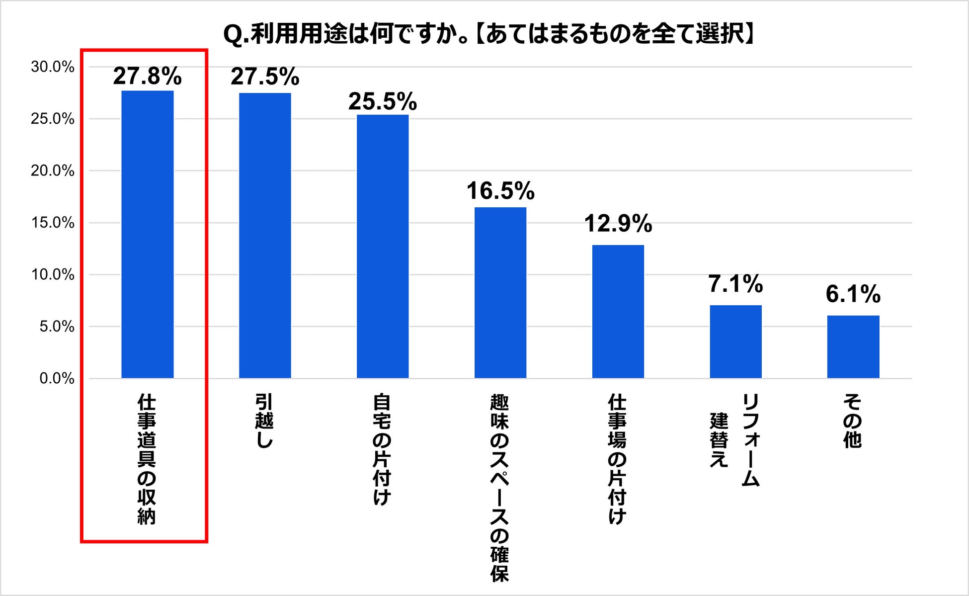 ハローストレージの利用者に対して、利用用途について尋ねたところ、最も多かった回答は「仕事道具の収納」(27.8%)で、以下、「引越し」(27.5%)、「自宅の片付け」(25.5%)という順となりました。