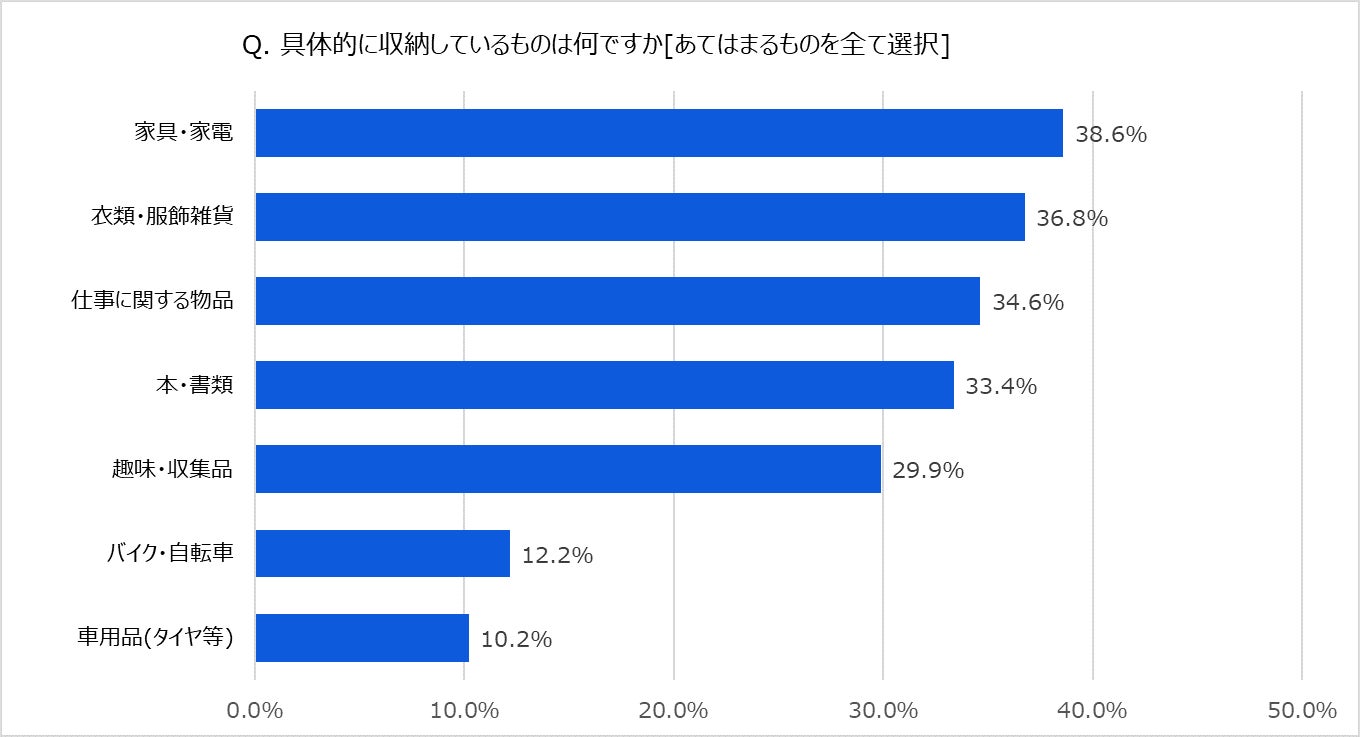 具体的に収納しているものについては、最も多かったのは「家具・家電」(38.6%)、続いて「衣服・服飾雑貨」(36.8%)、「仕事に関する物品」(34.6%)という結果となり、全体の3割以上が「仕事に関する物品」を収納していることが明らかになりました。