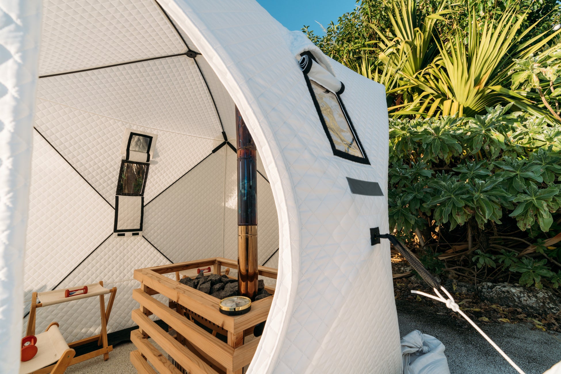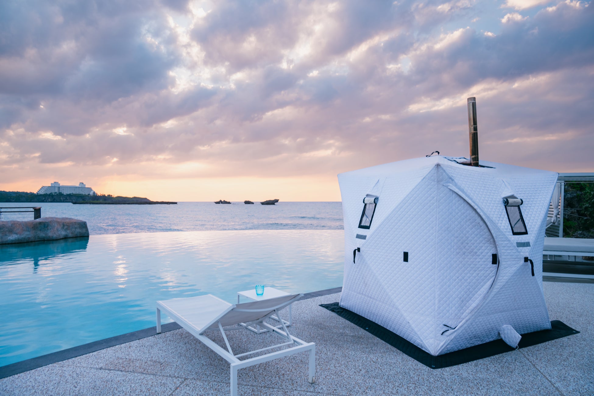 テントサウナが設置されるのは、東シナ海が一望出来るラグーンエリア。薪ストーブで90度近くまで温度が上がったテント内でセルフロウリュウを楽しみ、しっかり身体を温めていただきます。