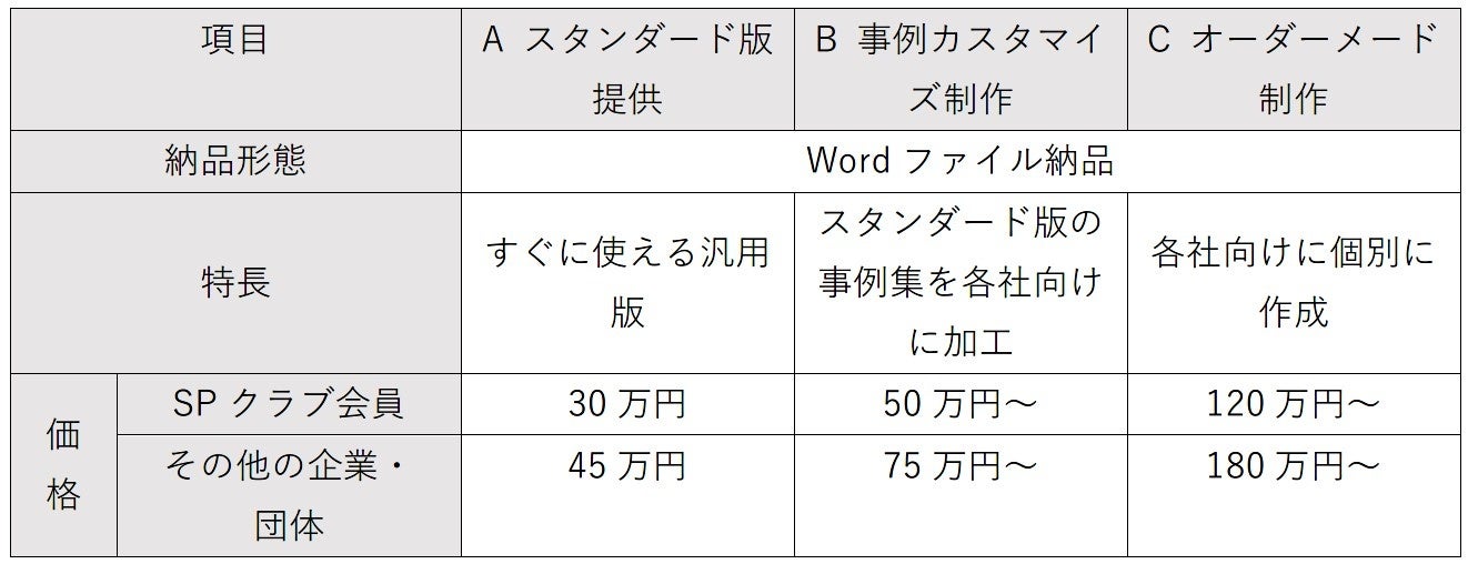 本商品は「A スタンダード版提供」と「B 事例カスタマイズ制作」と「Cオーダーメード制作」の3種類を用意し、各社の実態に合わせた支援が可能です。「A スタンダード版提供」は多くの業種ですぐに使える対応ノウハウをまとめています。「B 事例カスタマイズ制作」では、20の事例集について、業種や業態に合わせた内容にカスタマイズ制作します。「C オーダーメード制作」では、基本方針の策定や周知方法、教育体制などについてお打ち合わせのうえ、各社に合わせたマニュアルを制作し納品します。