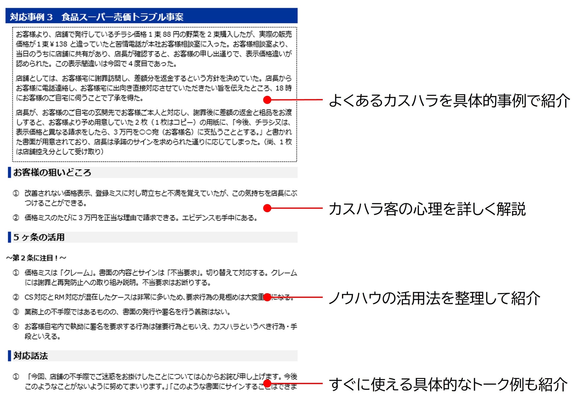 典型的なカスハラ事案に当てはめて活用できる原則的な対応法はもちろん、ケーススタディ形式、HowTo形式でカスハラ事例、カスハラ客側の心理、対応の注意点、応対トーク例などを20事例盛り込んだ、わかりやすい内容としています。
