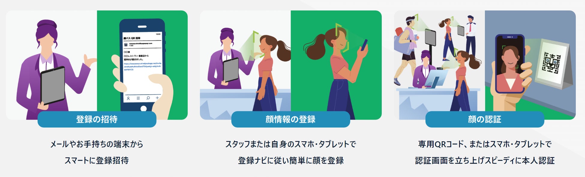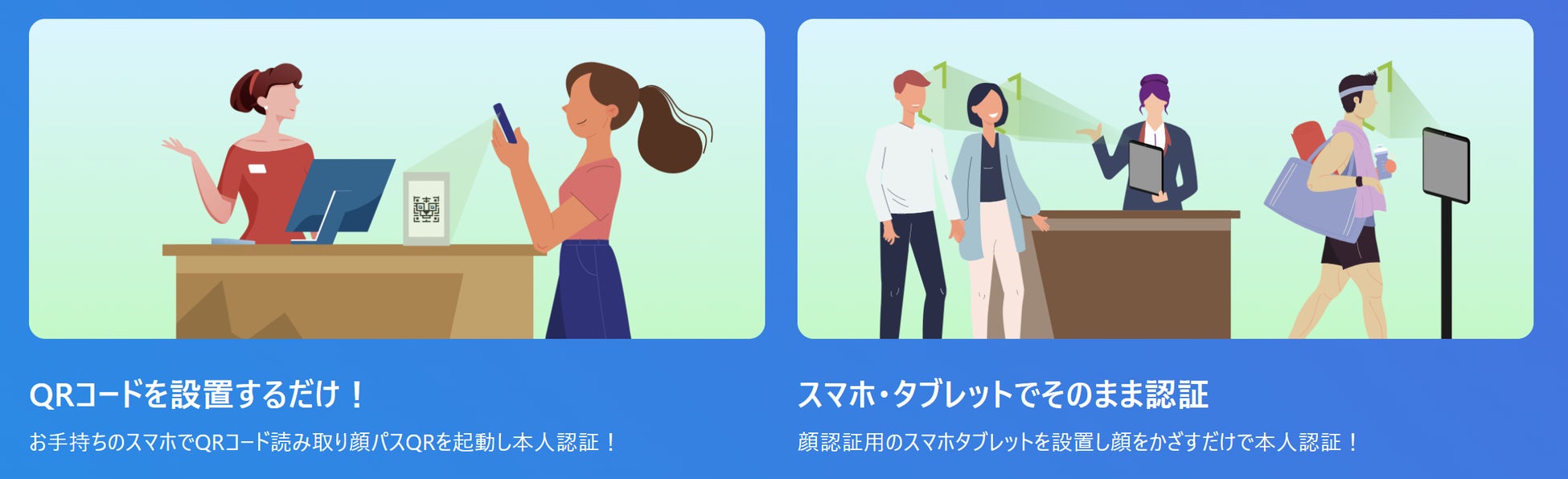 QRコードを読み取る、または設置したスマホやタブレットだけで「顔認証」が起動し、すぐに人物を特定・認証できます。