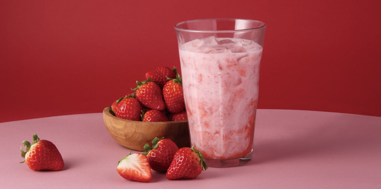 国産の苺と、苺シロップをミキシングし、ミルクと混ぜ合わせました。