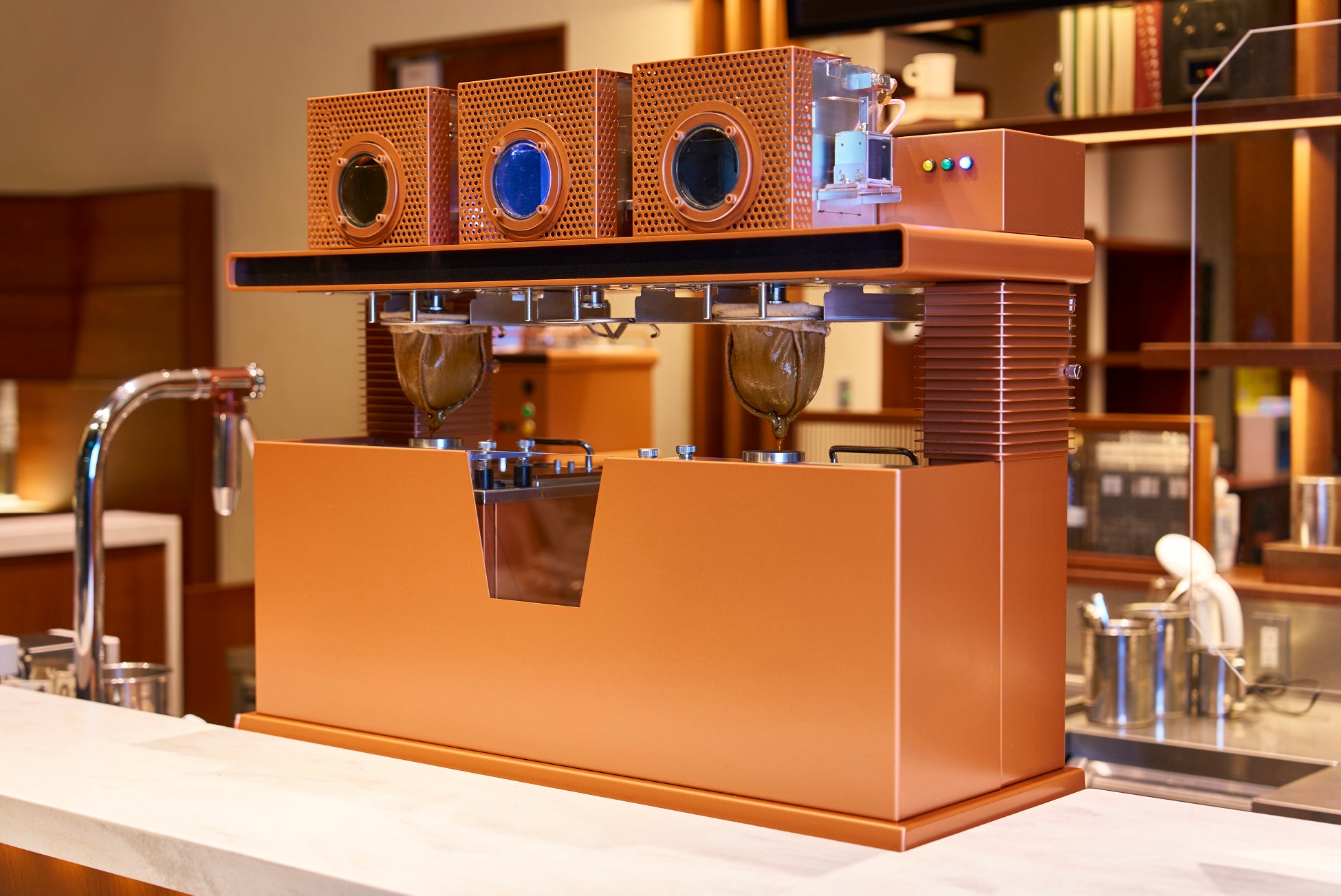 上島珈琲店の店舗では、「お客さまにおいしいコーヒーをお届けしたい」との想いで独自開発した「ネルドリップマシン(写真右)」で、コーヒー職人たちのこだわりがつまったコーヒーを提供しています。