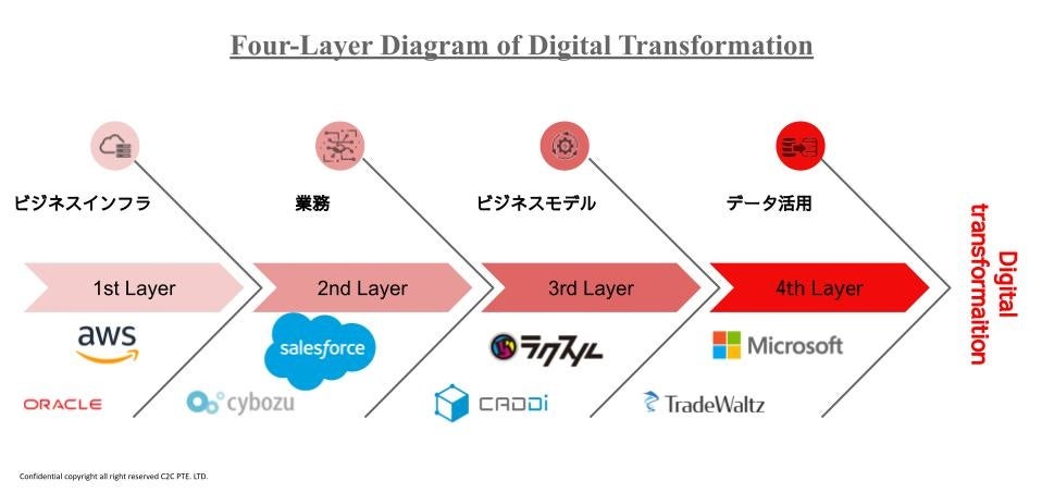 1層目や2層目についてはこの数年、課題意識が急激に上がり多くのプロダクトが登場してきましたが、3層目以降の積極的に業界構造を変革しにいく階層が2021年以降はメインストームになっていくと想定しています。3層目、4層目の階層のDX化の加速は、「合理化を進めるDX」から「未来の売上をつくるDX」へと新たな可能性に転換されていきます。 C2C社では、飲食店の仕込み代行サービスである「シコメル」がまさに飲食業界における3層目のDX化に取り組んでおり、事業進捗に応じ4層目のDX化を推進していく計画です。C2C社が展開するC2C プラットフォームは、3層目にあたる受発注のDX化を中心に各階層を一気通貫でDX化できるサービスで、2021年は受発注で多重請負が発生しているレガシーな業界の課題を解決したいという問い合わせが増えております、2022年は、CtoCのダイレクトマッチングで培ったマッチングビジネスのノウハウとデータドリブンなサービス設計により、様々な業界におけるのDX化を推進し産業構造の改革に貢献して参ります。