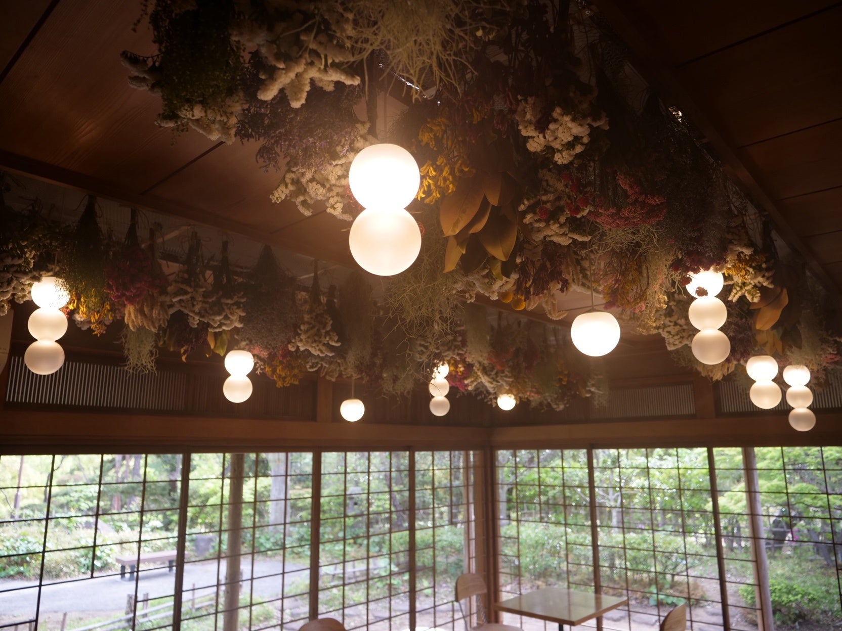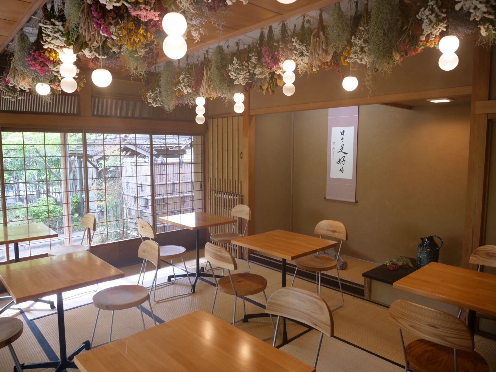 内装は茶室の畳をそのまま活用し、新しく家具を配置した解放感のある空間で、新しくもどこか懐かしい雰囲気です。