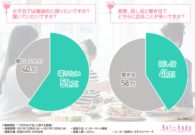 そこで、「女子会では積極的に喋りたいですか?聞いていたいですか?」と質問したところ、6割近くの方が『喋りたい(59.7%)』と回答しました。