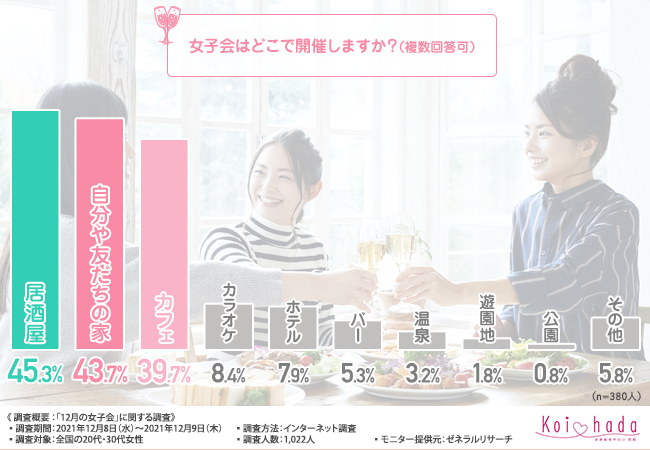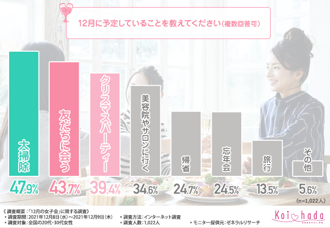 そこで今回、脱毛サロン『恋肌』(https://www.koi-hada.jp/)は、全国の20代・30代女性を対象に、「12月の女子会」に関する調査を実施しました。