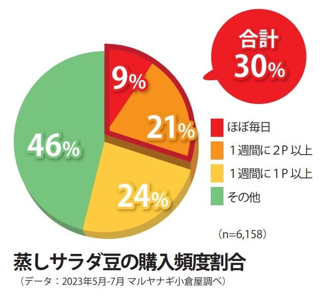 当社が「おいしい蒸し豆 蒸しサラダ豆」のユーザーを対象に、「購入頻度」を尋ねた調査によると、「ほぼ毎日購入」「1週間に2P以上購入」と回答した方の合計は30%