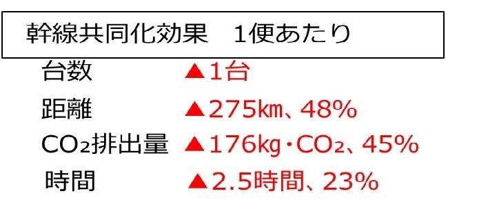 今回の実証実験の結果、幹線でのセンター間の横持ちを共同化することにより、1便あたり以下の効果があることが分かりました。