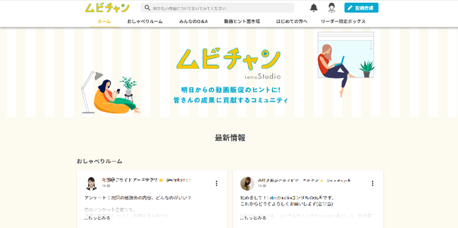 ムビチャンは、LetroStudioを利用するユーザー同士がカジュアルにコミュニケーションを取ることができ、動画制作に関わる広範な情報収集と問題解決が行えるオンライン空間です。LetroStudioユーザーが自らの販促成果や挑戦を共有してデジタル販促の新たな知見を得ることで、ユーザー自身が向き合う業務の成果を向上できるコミュニティを目指します。