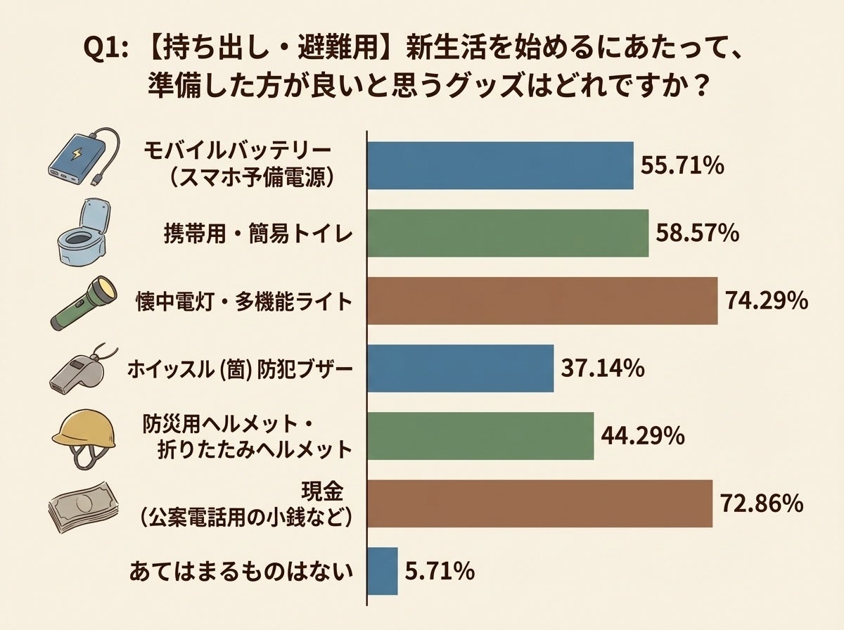持ち出し用の防災グッズでは、「懐中電灯・多機能ライト(74.29%)」「現金(72.86%)」が上位となりました。また、「携帯用トイレ(58.57%)」「モバイルバッテリー(55.71%)」など、災害時の生活継続に直結するアイテムも半数以上が必要と回答しています。
