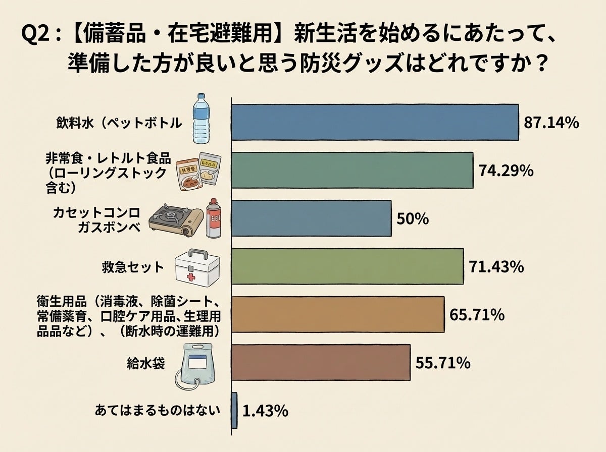 新生活にあたって準備すべき防災グッズとして最も多く挙がったのは「飲料水(87.14%)」でした。次いで「非常食・レトルト食品(74.29%)」「懐中電灯・多機能ライト(74.29%)」「現金(72.86%)」と続き、災害時に直接的な生活維持に関わる備蓄品の重要性が高く認識されていることが分かりました。