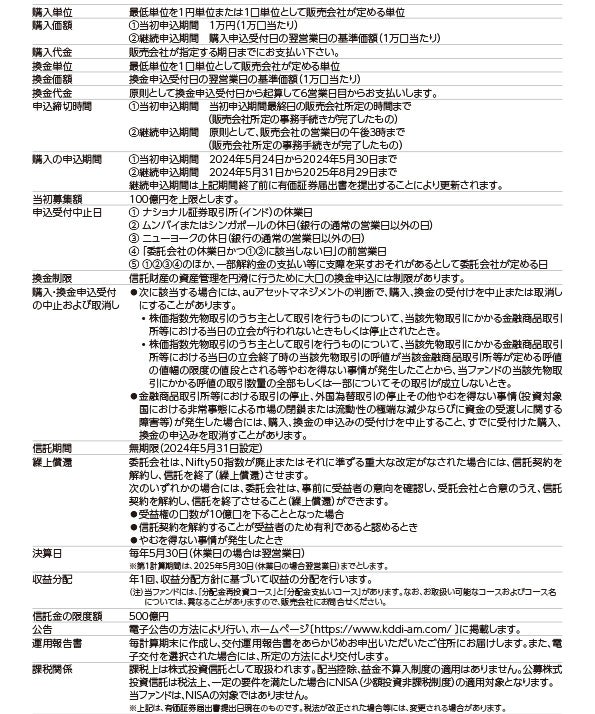 当ファンドは、NSE INDICES LIMITEDが発起、保証、販売または販売促進を行っているものではありません。NSE INDICES LIMITEDは、当ファンドの所有者または一般のいかなる人に対しても、有価証券全般または当ファンドへの 投資の妥当性、あるいはNifty50指数のインド株式市場全体のパフォーマンスへの連動性について、明示的か黙示的か を問わず、何らの表明もしくは保証を行いません。NSE INDICES LIMITEDとauアセットマネジメント株式会社との関 係は、NSE INDICES LIMITEDが、auアセットマネジメント株式会社または当ファンドとは無関係に決定、構築および算出を行う指数と指数に関連する商標および商号についての使用を許諾することだけでしかありません。NSE INDICES LIMITED は、Nifty50指数の決定、構築および計算に関して、auアセットマネジメント株式会社または当ファンドの所有者の要望を考慮する義務を負いません。NSE INDICES LIMITED は、当ファンドの設定に関してその時期、価格もしくは 数量の決定について、または当ファンドを換金する際の算式の決定もしくは計算についての責任を負っておらず、また関 与もしていません。NSE INDICES LIMITEDは、当ファンドの管理、販売または取引に関していかなる義務または責任も 負いません。NSE INDICES LIMITEDは、Nifty50指数とそれに含まれるデータの正確性、完全性を保証するものではなく、その誤り、欠落、障害に対していかなる責任も負わないものとします。NSE INDICES LIMITEDは、Nifty50指数また はそれに含まれるデータの利用により、auアセットマネジメント株式会社、当ファンドの所有者、またはその他いかなる者 もしくは組織に生じた結果についても、明示的か黙示的かを問わず、何らの保証も行いません。NSE INDICES LIMITED は、明示的か黙示的かを問わず、何らの保証も行わず、かつNifty50指数またはそれに含まれるデータに関して、商品性 または特定の目的または使用に対する適合性のすべての保証を明示的に否認します。上記に関わらず、NSE INDICES LIMITEDは、いかなる直接的、特別の、懲罰的、間接的または結果的損害(逸失利益を含む)も含めて、本ファンドに起因または関連するあらゆる請求、損害または損失について、たとえそれらの可能性につき通知されていたとしても、何らの責任も負いません。