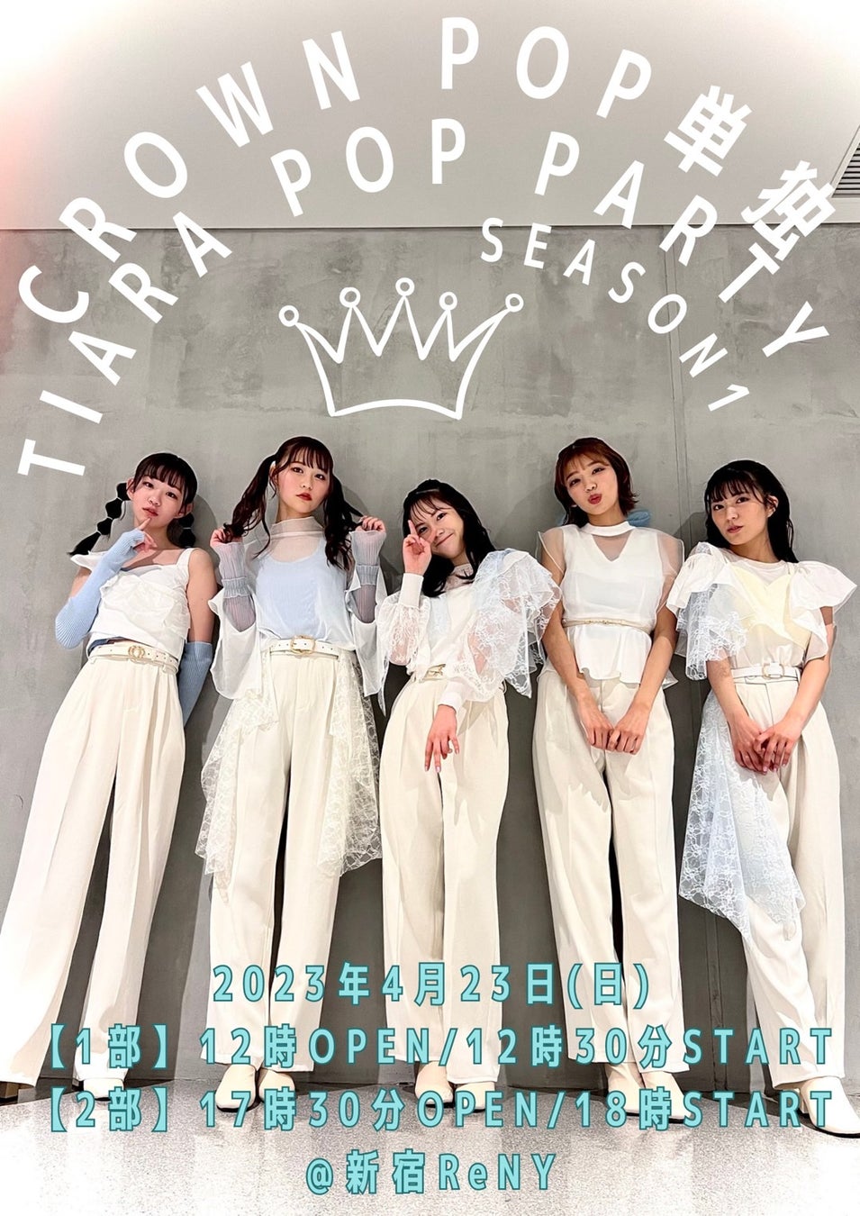 CROWN POP単独ライブ「TIARA POP PARTY Season1」が2023年4月23日(日)に新宿ReNY(新宿区西新宿6-5-1)にて開催されます。チケットは電子チケット販売サービス「TIGET」にて販売中です。