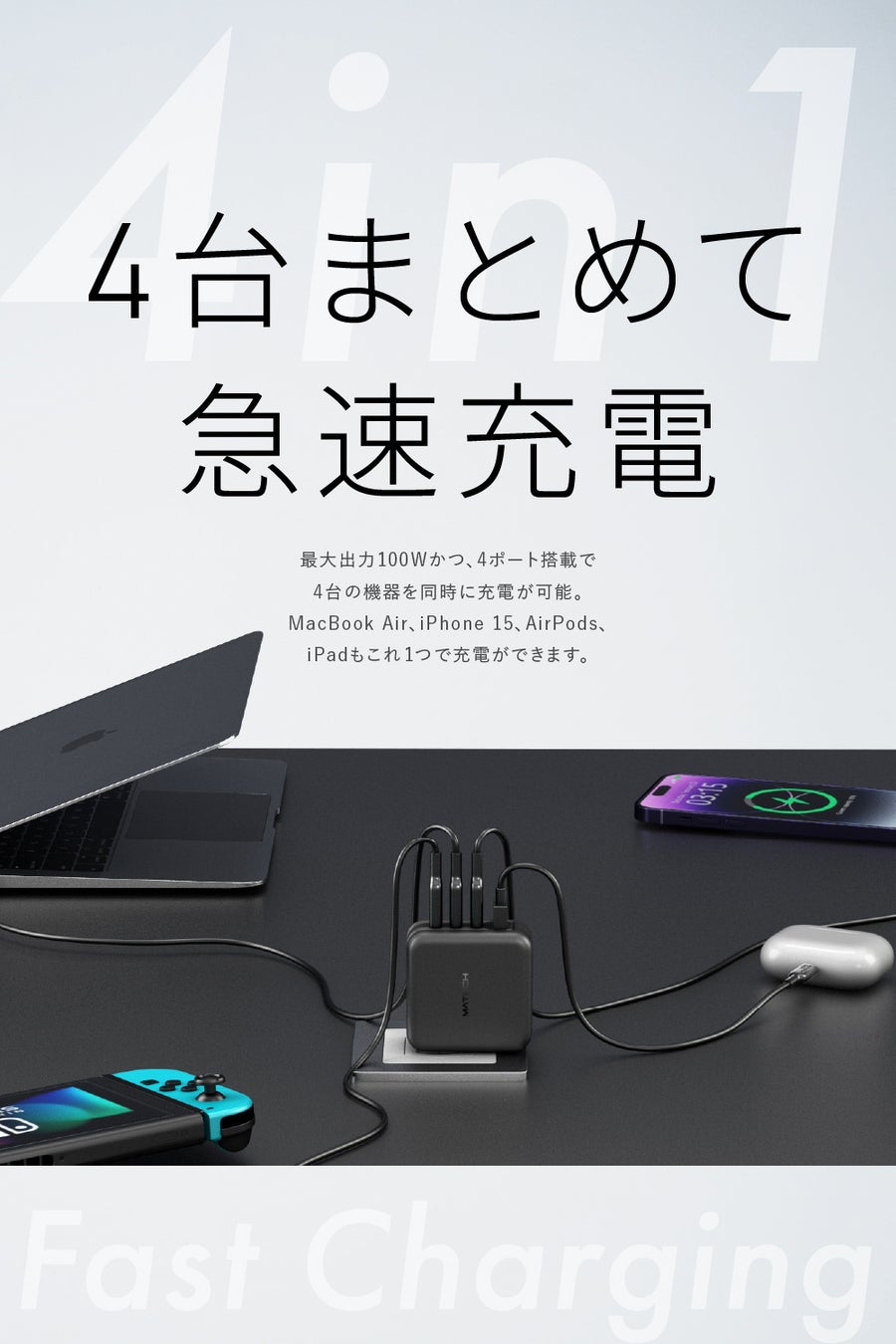 「4ポート・100W」カテゴリにおいて世界最小クラスのコンパクトさを実現しています。