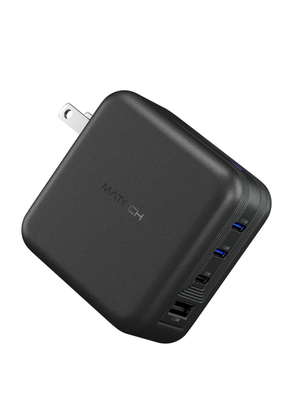 USB-C×3ポートとUSB-A×1ポートを備えた4ポート構成ながら、世界最小クラスの筐体に最大100Wの高出力を凝縮。ノートPCを含む最大4台の機器を同時に充電できる設計で、高出力とコンパクトさを両立しました。