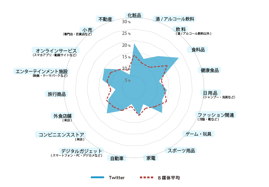 Twitterも8媒体平均と比べて多くのジャンルで高い数値となりました。なかでも食料品(23%)、化粧品(19%)、飲料(酒・アルコール以外)(13%)といったジャンルでの影響力が目立つ結果となりました。