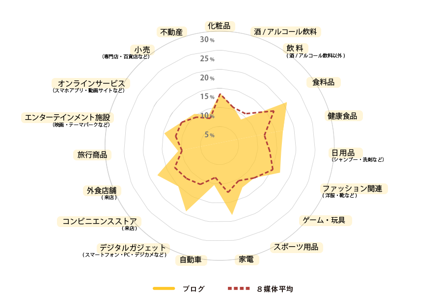 ブログもほぼ全てのジャンルで8媒体平均と比べ、高い数値となったSNSです。食料品(21%)、デジタルガジェット(スマートフォン・PC・デジカメなど)(19%)、家電(18%)外食店舗(18%)などのジャンルで、数値が高くなっています。
