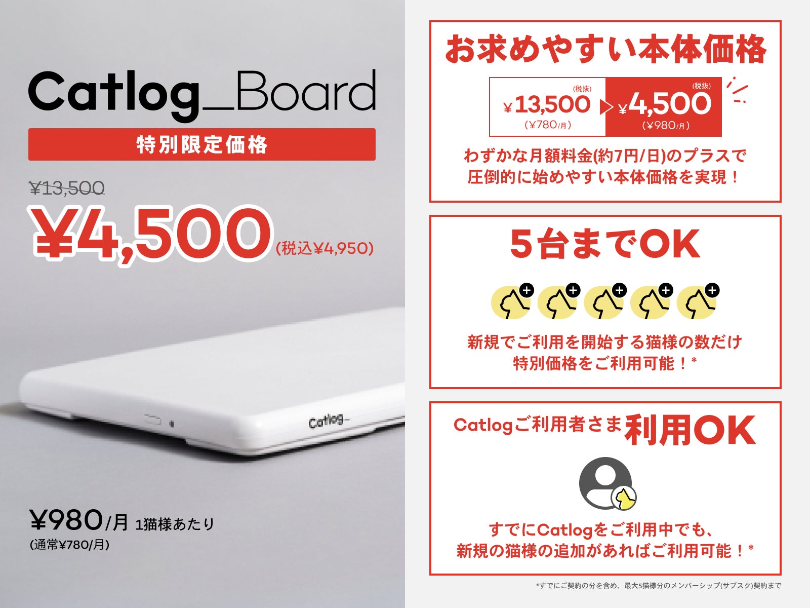 ①期間限定で、Catlog Boardの本体価格が¥4,500(税別)に!月額料金を約7円/日のわずかなプラスで、通常価格から70%OFFのお求めやすい本体価格でCatlog Boardを導入していただけます。
