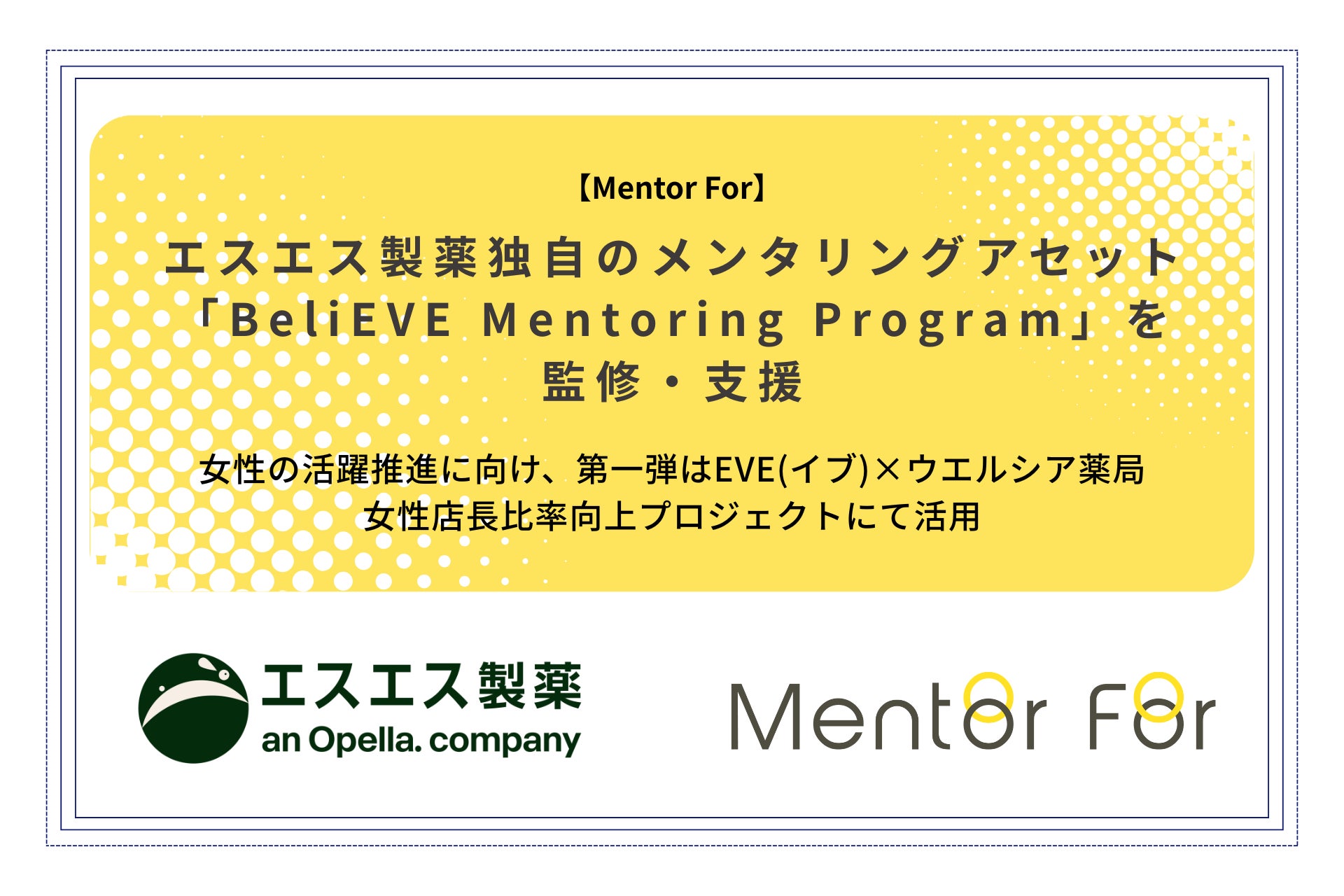 企業のDE&I(Diversity, Equity & Inclusion)・女性活躍推進を目的とした、社外メンターの育成・マッチング・社内メンター制度支援を提供する株式会社Mentor For(東京都品川区、代表取締役CEO・池原真佐子、以下Mentor For)は、エスエス製薬株式会社(東京都新宿区、代表取締役社長・ニクヒレッシュ・カルラ、以下エスエス製薬)の解熱鎮痛薬ブランド『EVE(イブ)』による、独自のメンタリングアセット「BeliEVE Mentoring Program」を監修・支援しました。「BeliEVE Mentoring Program」は、働く女性の活躍推進を目指して開発したメンタリングプログラムで、今後様々な場で提供される予定です。