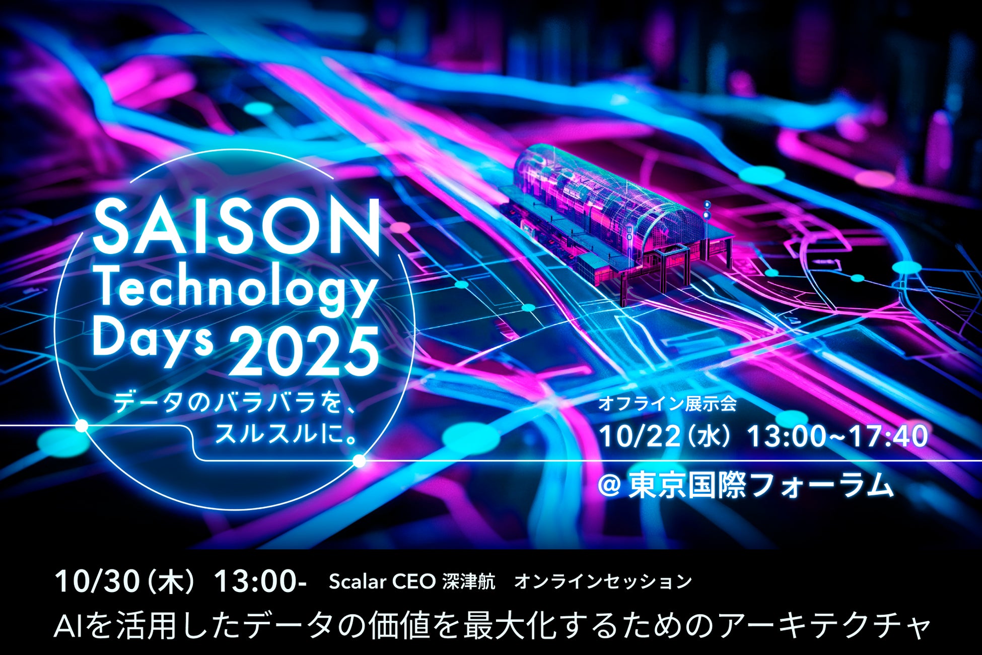 株式会社Scalar(本社:東京都、代表取締役CEO:深津航、代表取締役CTO:山田浩之、以下、Scalar)は、2025年10月に開催される「SAISON Technology Days 2025」に参加し、オフラインでのブース出展およびオンラインセッションにて講演を行います。
