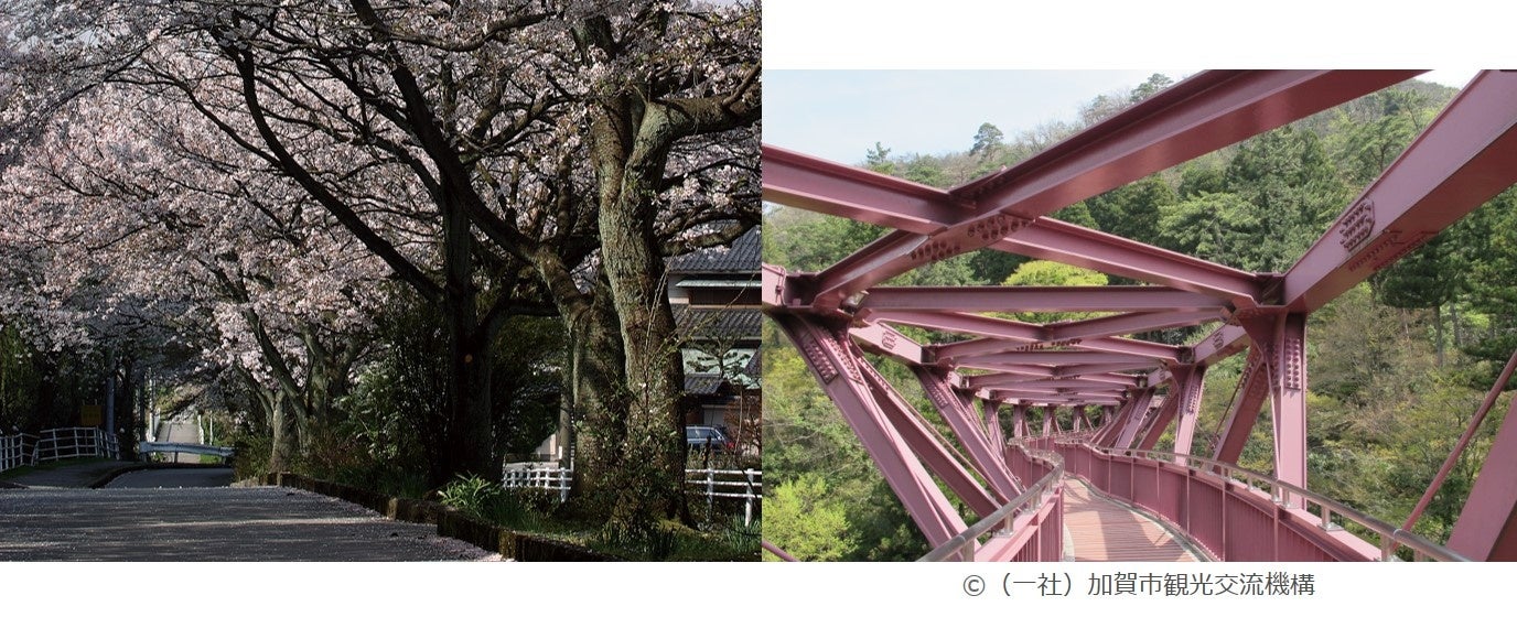 華道家 勅使河原宏氏デザインのユニークなS字型の橋で、類の無い形状と美しい紅紫色のモダンさを併せ持っています。また、橋から見える加賀市を代表する渓谷、鶴仙渓の眺めは絶景です。