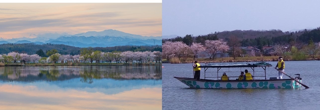 白山や田園の風景と調和した木場潟を自然のまま残した水郷公園です。木場潟を周遊できる「周遊園路」は「美しい日本の歩きたくなる道」500選のひとつに選ばれており、約1,700本の桜並木が続きます。「木場潟」「桜」「白山」が共演する絶景を求めて、毎年多くの観光客が訪れます。