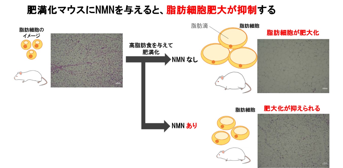 •NMNは、マウスにおいて脂肪細胞の肥大を抑制することにより、