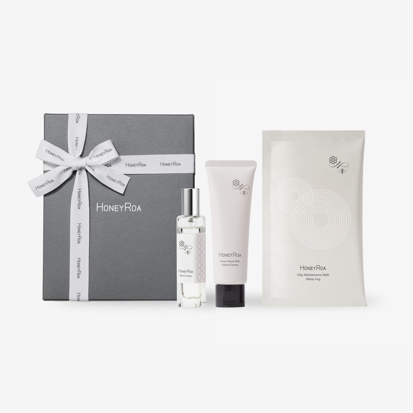 「フレグランス サクラコスモ」と「グリーンハンド99% サクラコスモ」のセットに、美肌をつくる入浴剤「クレイメンテナンスバス ホワイトフォグ」を1包プレゼントのお得なギフトボックス。