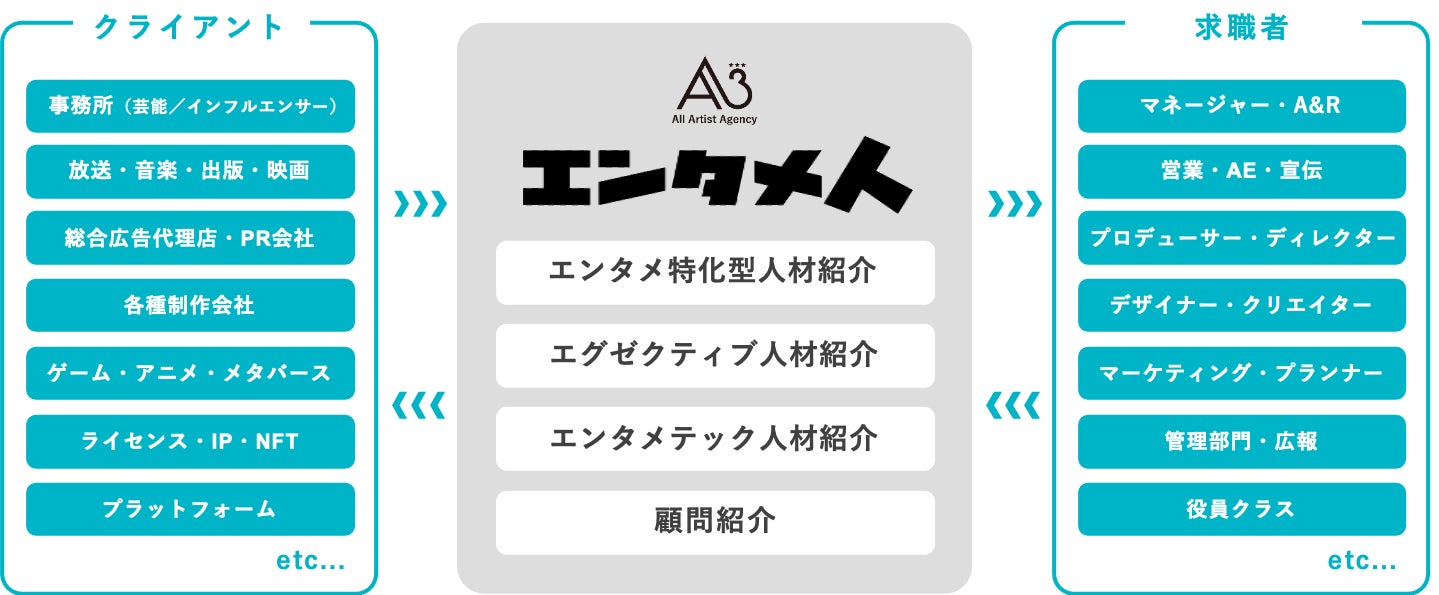 「世界の才能をつなぐプロフェッショナル」をミッションに、あらゆる“才能”をマッチングするプラットフォーマーです。タレント、芸人、俳優、モデル、VTuber、YouTuber、アイドル、歌手、声優、アスリート、専門家、文化人、クリエイター、アーティスト、コスプレイヤー、エキストラ、MC、キャラクター等をご要望に応じて最適にアサインする「総合キャスティング事業」、「エンタメ特化型総合人材事業」、「エンタメ特化型M&A仲介事業」、タレントのセカンド・パラレルキャリアを支援する「タレント支援プロジェクト」を展開しています。