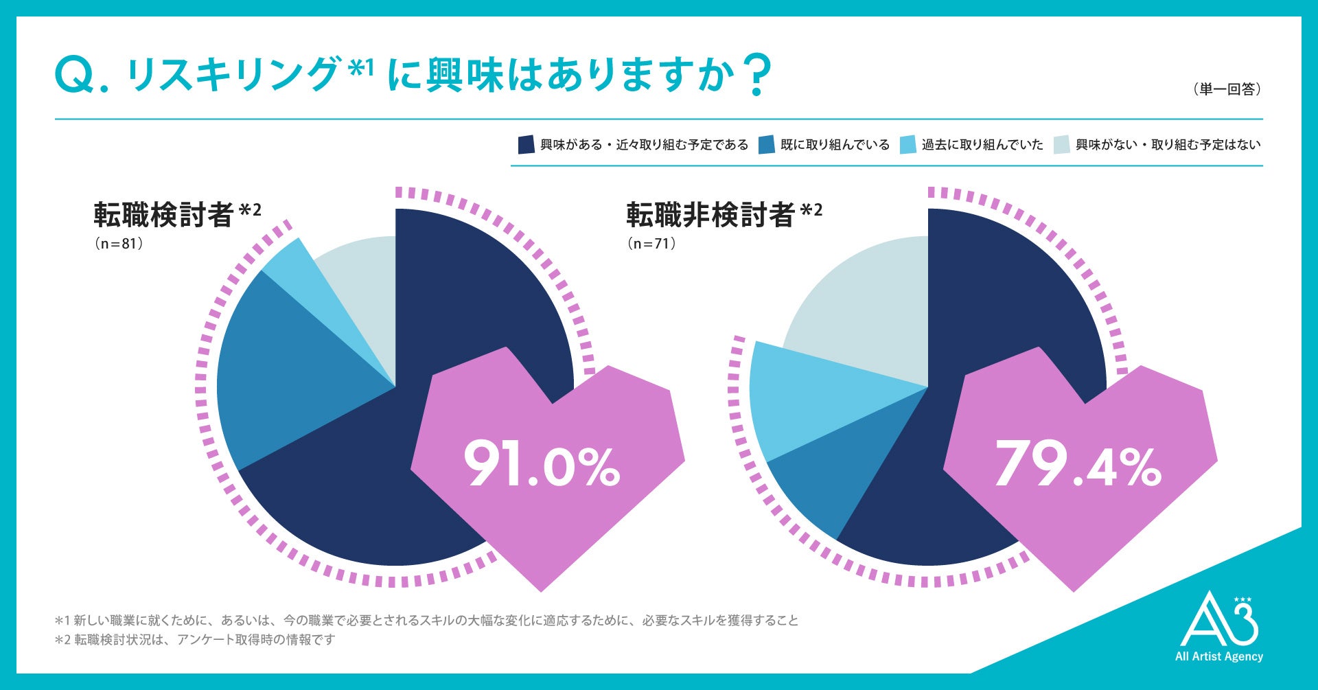・転職検討者の91.0%と、転職非検討者の79.4%がリスキリングに高い興味関心を持つ結果となり、リスキリングは転職検討者だけでなく、現職で働くうえでも重視されている傾向に