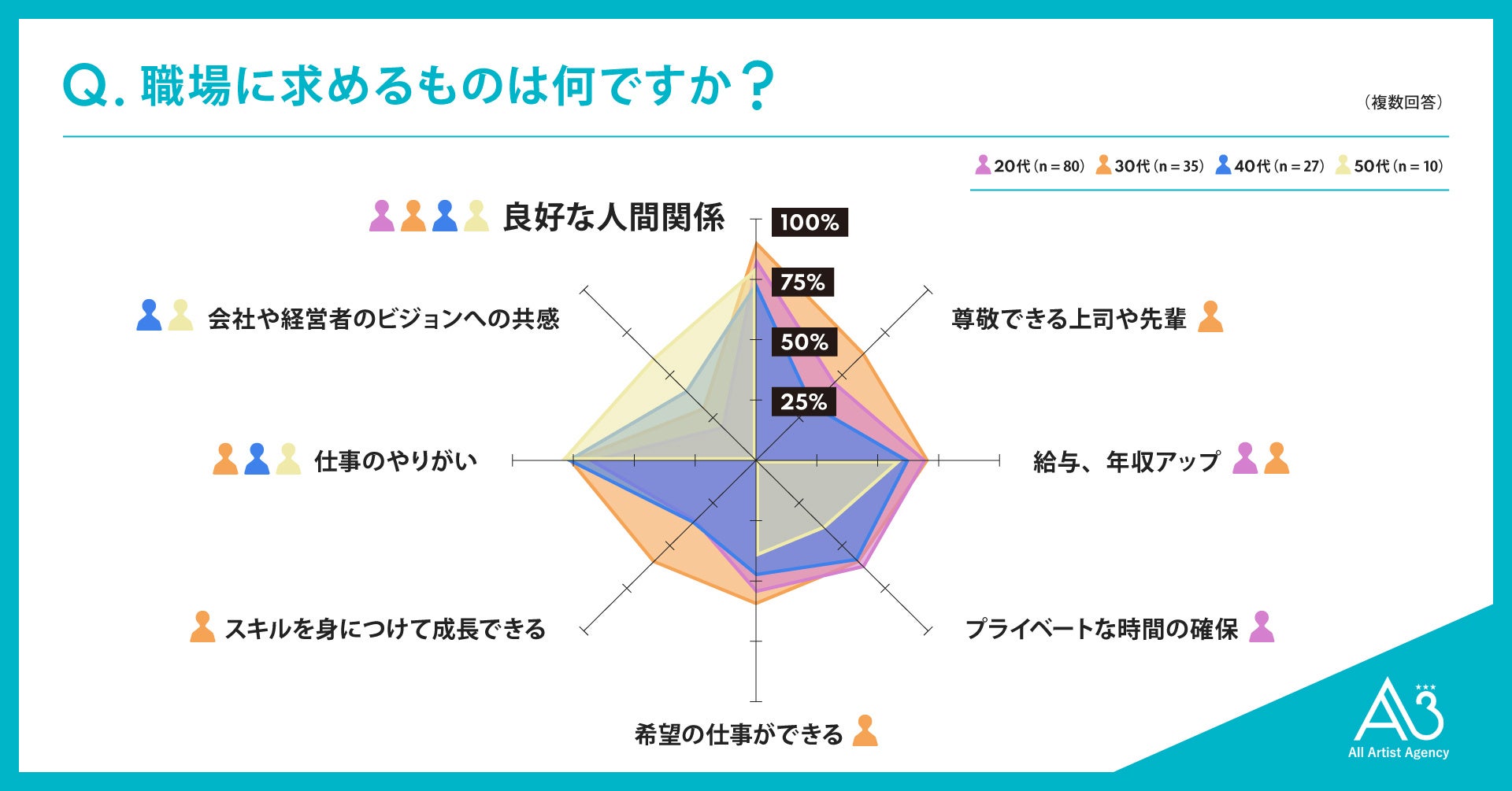 30代では「良好な人間関係」「尊敬できる上司や先輩」「給与、年収アップ」「希望の仕事ができる」「スキルを身につけて成長できる」「仕事のやりがい」の回答が多く、特に他年代より「スキルを身につけて成長できる」の回答の多さが目立ちました。