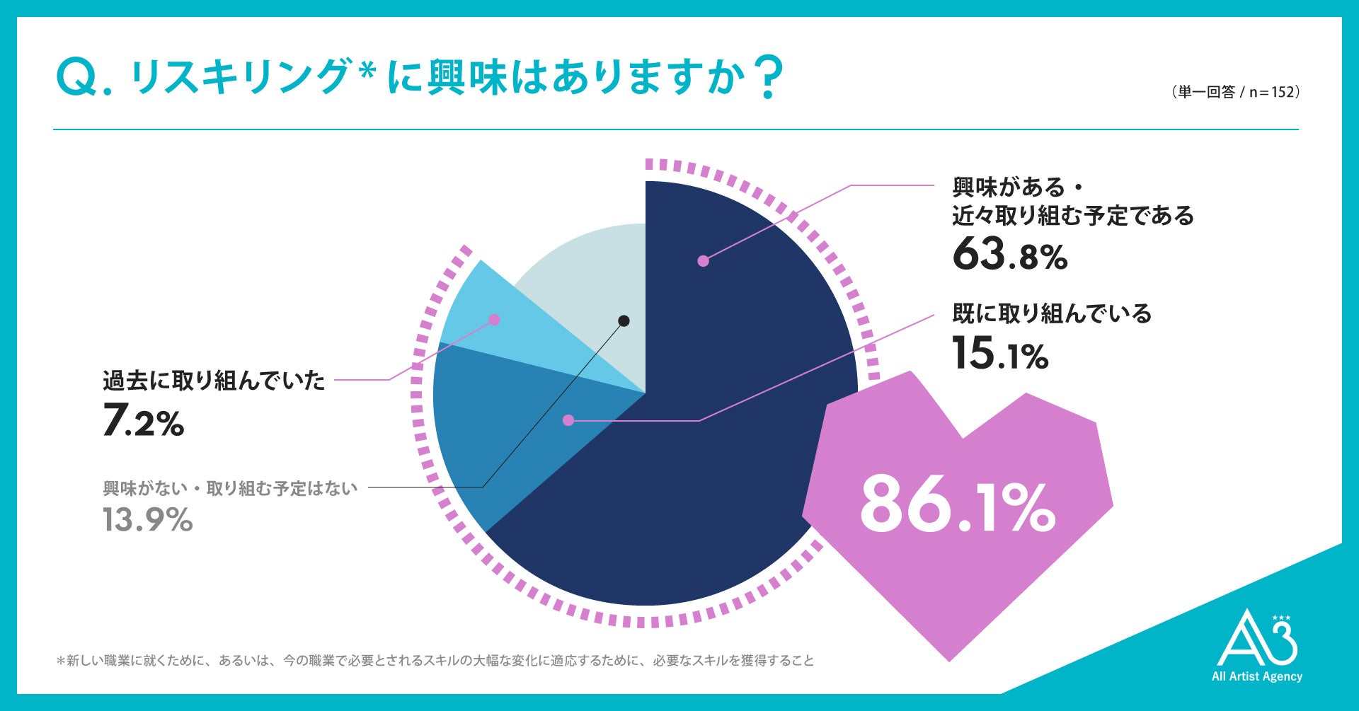 全体の86.1%が、リスキリングに関して「興味がある/近々取り組む予定である」「既に取り組んでいる」「過去に取り組んでいた」のいずれかを回答しました。