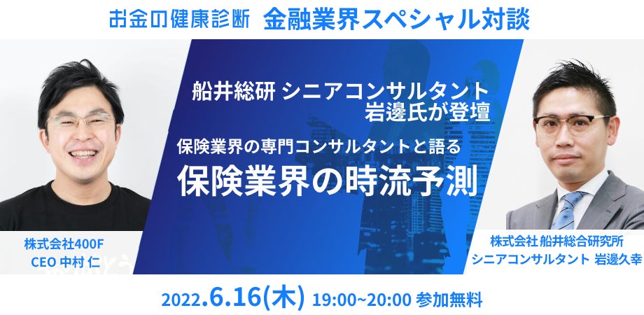 お金の相談マッチングプラットフォーム「お金の健康診断」を運営する株式会社400F(フォーハンドレッド・エフ、本社:東京都中央区、代表取締役社長:中村 仁、以下「400F」)は、2022年6月16日(木)19時より、船井総合研究所 岩邊氏とスペシャル対談「保険業界の専門コンサルタントが語る データに基づいた保険業界の時流予測」をオンラインにて開催いたします。