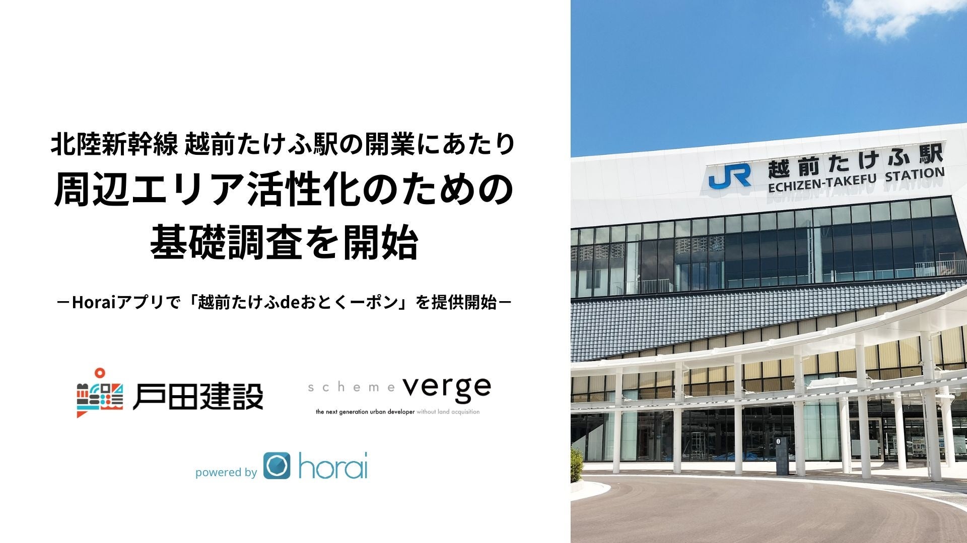 scheme verge株式会社(本社:東京都文京区、代表取締役CEO:嶂南 達貴、以下scheme verge)と戸田建設株式会社(本社:東京都中央区、社長:大谷 清介、以下戸田建設)は、北陸新幹線 越前たけふ駅の開業にあたり周辺エリア活性化のための基礎調査(以下、本調査)を共同で開始しました。scheme vergeは、戸田建設が行ったアイデアコンテストの最優秀賞受賞者です。