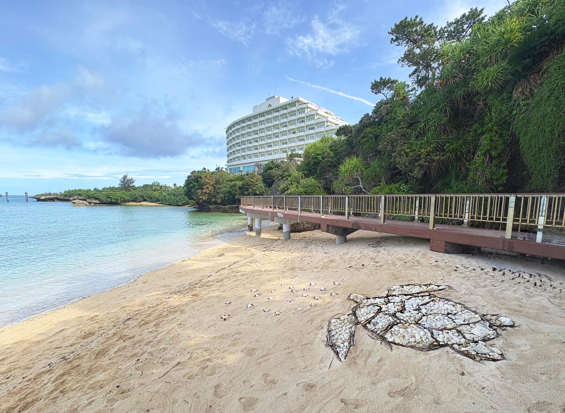 ホテルビーチの砂浜に、サンゴや石、流木、軽石などの自然素材を使って、ウミガメと子ガメの姿をアートで表現。自然とともに生きる命のつながりを感じるインスタレーションです。ウミガメたちが安心して暮らせる海を未来へ残すために、私たちができることをこれからも全力で続ける意思表示として描きます。