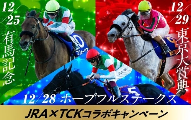 JRAのグランプリレース「12/25 有馬記念(GⅠ)」と「12/28 ホープフルステークス(GⅠ)」、ダート競馬の総決算「12/29 東京大賞典(GⅠ)」の3つのGⅠレースをつなぐ「有馬記念×ホープフルステークス×東京大賞典コラボキャンペーン」を実施中!