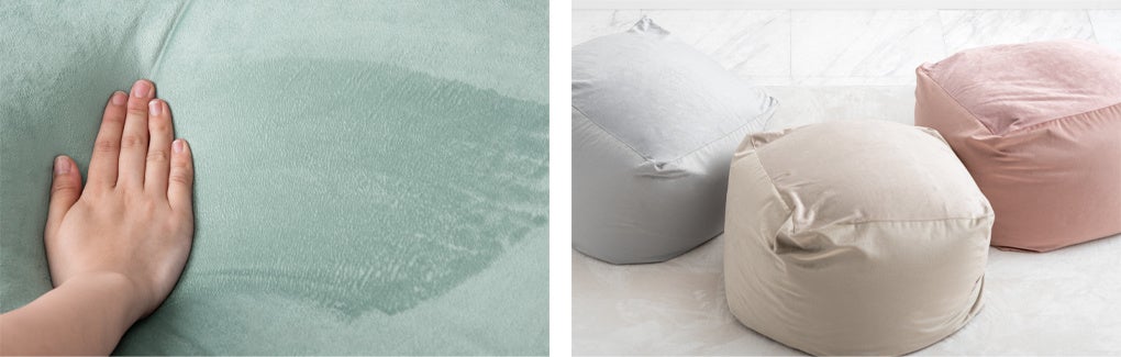ベルベット生地をビーズクッションに用いることで、滑らかな手触りと、高級感のあるインテリア性の両立を実現しました。また、くすみカラーとも相性がよく、優雅なデザインなっています。