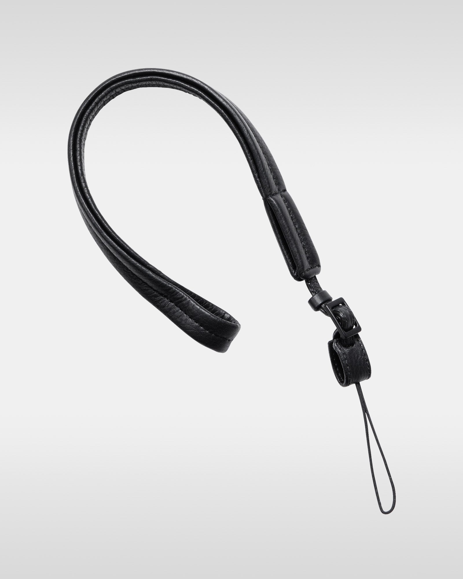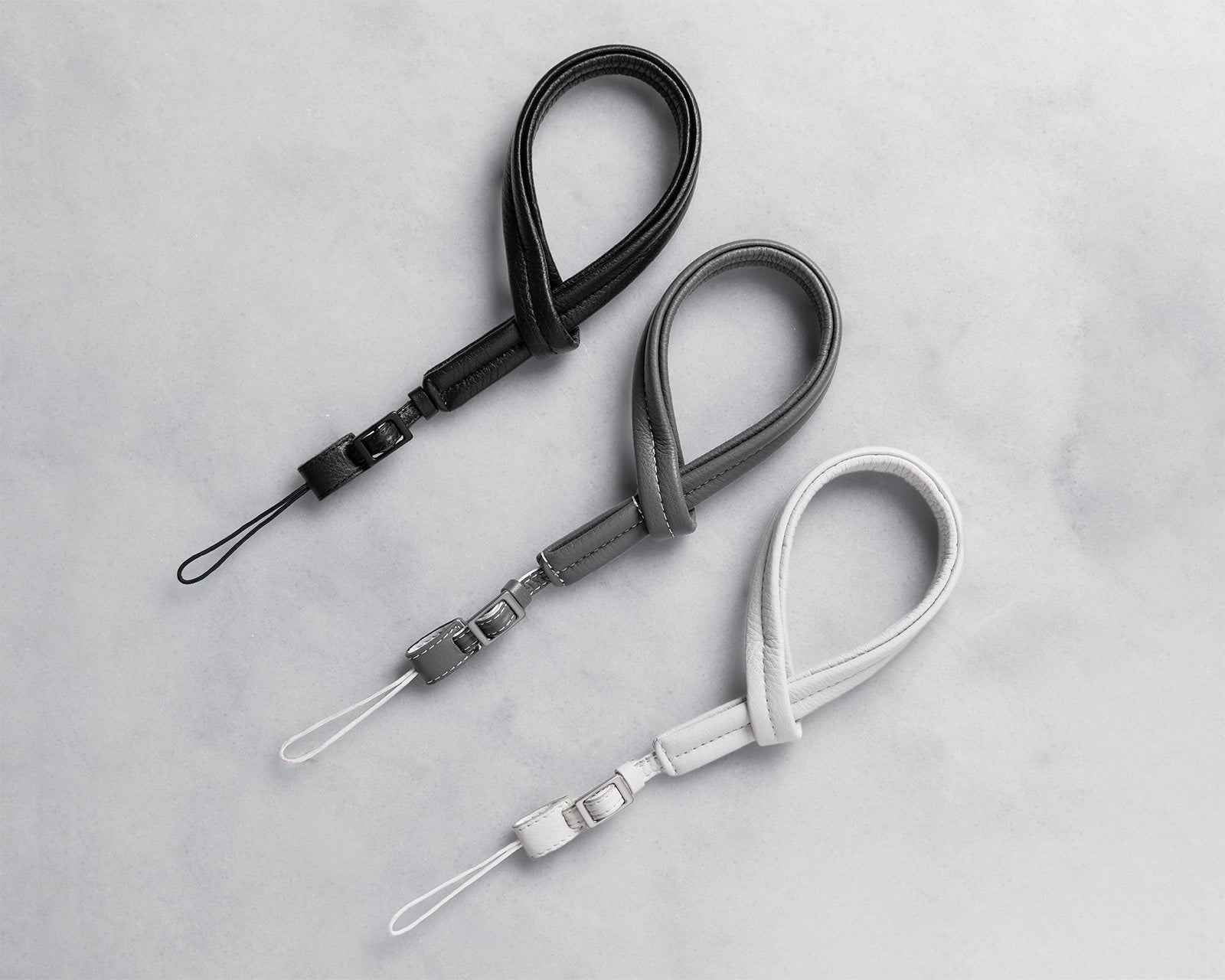 弾力のあるスポンジ系の芯材を内部に仕込み、柔らかな革の質感とクッション性が感じられるストラップに仕立てました。レザーと色味を合わせた調節金具や取付コードなど、統一感のある美しさを追求。カラーは「ブラック」、「オフホワイト」、「グレー」の3色で展開します。